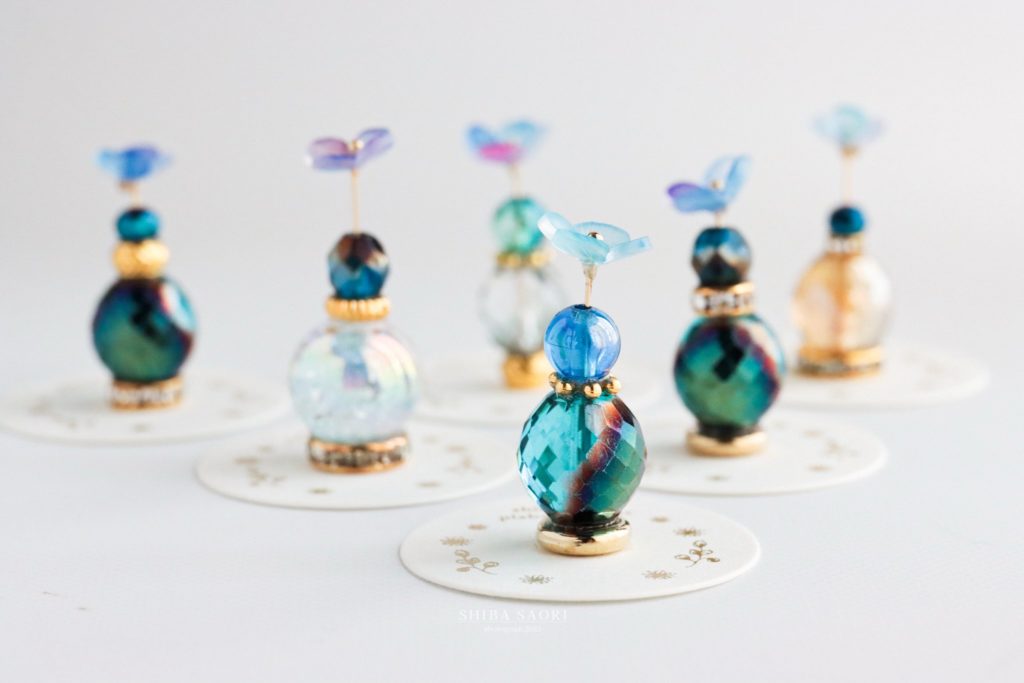 自分の好きな組み合わせでビーズを接着して小瓶に見立てて、(ビーズやスペーサーは様々な種類のものを私の方で用意しています)